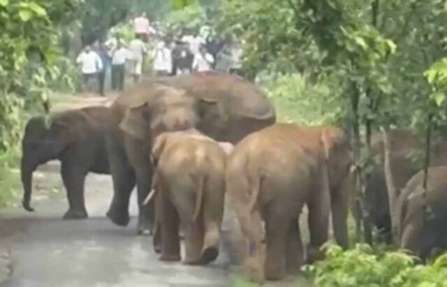 जिले के एडु-सिंघनपुर मार्ग पर शनिवार को जंगल से निकलकर आधा दर्जन हाथियों का दल अचानक सड़क पर पहुंच गया. हाथियों को देखकर ग्रामीणों में अफरा-तफरी मच गई. हाथियों ने सड़क के बीच खड़े होकर रास्ता जाम कर दिया, जिससे दोनों ओर वाहनों की आवाजाही ठप हो गई.