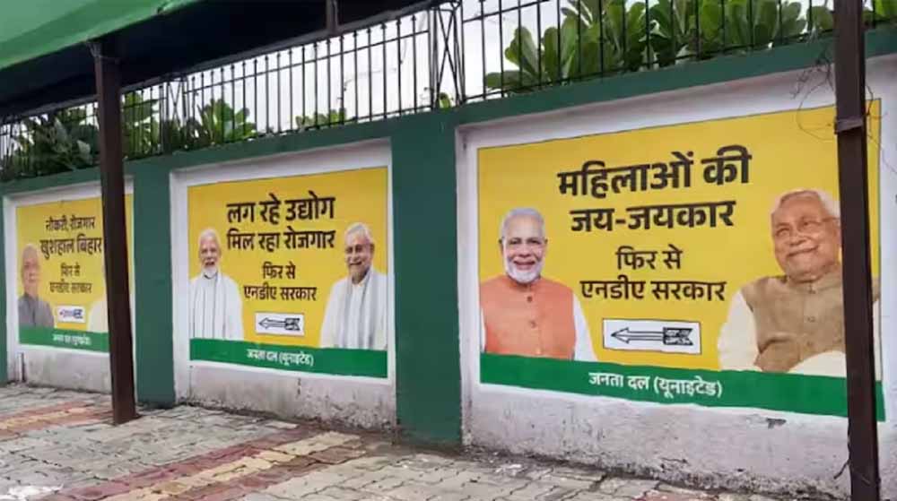 बिहार विधानसभा चुनाव 2025 से पहले सियासी गलियारे में पोस्टर पॉलिटिक्स चरम पर है। इस बीच पटना में जनता दल यूनाइटेड (जेडीयू) के कार्यालय में प्रधानमंत्री नरेंद्र मोदी और मुख्यमंत्री नीतीश कुमार के पोस्टर लगाए गए हैं। पोस्टर में एनडीए सरकार की उपलब्धियों को बताते हुए दोबारा सरकार बनाने की अपील करते हुए नारे लिखे गए हैं। इन पोस्टर के जरिए बीजेपी और जेडीयू में एकजुटता को दिखाने की कोशिश की गई है। बताया जा रहा है कि यह पहला मौका है जब जेडीयू दफ्तर में औपचारिक रूप से मोदी और नीतीश के एक साथ पोस्टर लगाए गए हैं।