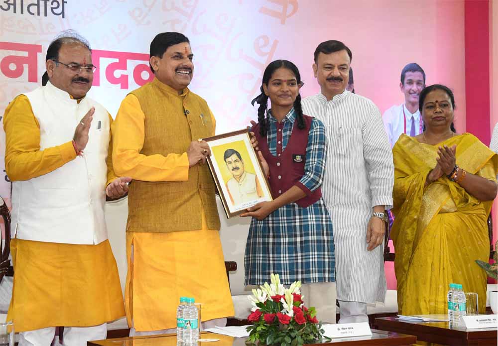 मुख्यमंत्री डॉ. यादव को छात्रा संतोषी साहू ने हस्तनिर्मित पोर्ट्रेट भेंट किया