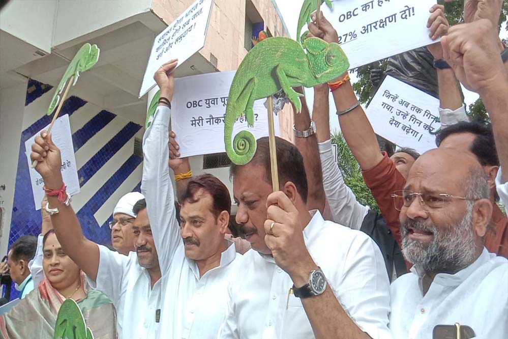 मध्य प्रदेश विधानसभा का मानसून सत्र शुरु होने से पहले कांग्रेस ने सदन के बाहर प्रदर्शन किया. विधानसभा के नेता प्रतिपक्ष उमंग सिंघार गिरगिट लेकर पहुंचे. नेता प्रतिपक्ष बोले ओबीसी आरक्षण के मामले में गिरगिट की तरह रंग बदल रही है सरकार.