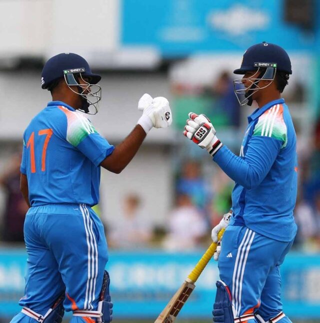 हारून जॉर्ज की क्लासिक बैटिंग! नंबर-3 पर बैटिंग करने आए हारून जॉर्ज क्लासिक बल्लेबाजी कर रहे हैं। बेहतरीन टाइमिंग के साथ शॉट्स लगा रहे हैं। वह अभी तक 6 चौकों की मदद से 27 के निजी स्कोर पर पहुंच गए हैं। वहीं आयुष म्हात्रे 38 रन बनाकर खेल रहे हैं। आयुष म्हात्रे रुकने का नाम नहीं ले रहे हैं। 6ठे ओवर की आखिरी गेंद पर उन्होंने सामने की तरफ शानदार छक्का लगाकर भारत के स्कोर को 50 के पार पहुंचाया। भारतीय कप्तान 21 गेंदों पर 37 के निजी स्कोर पर पहुंच गए हैं।
