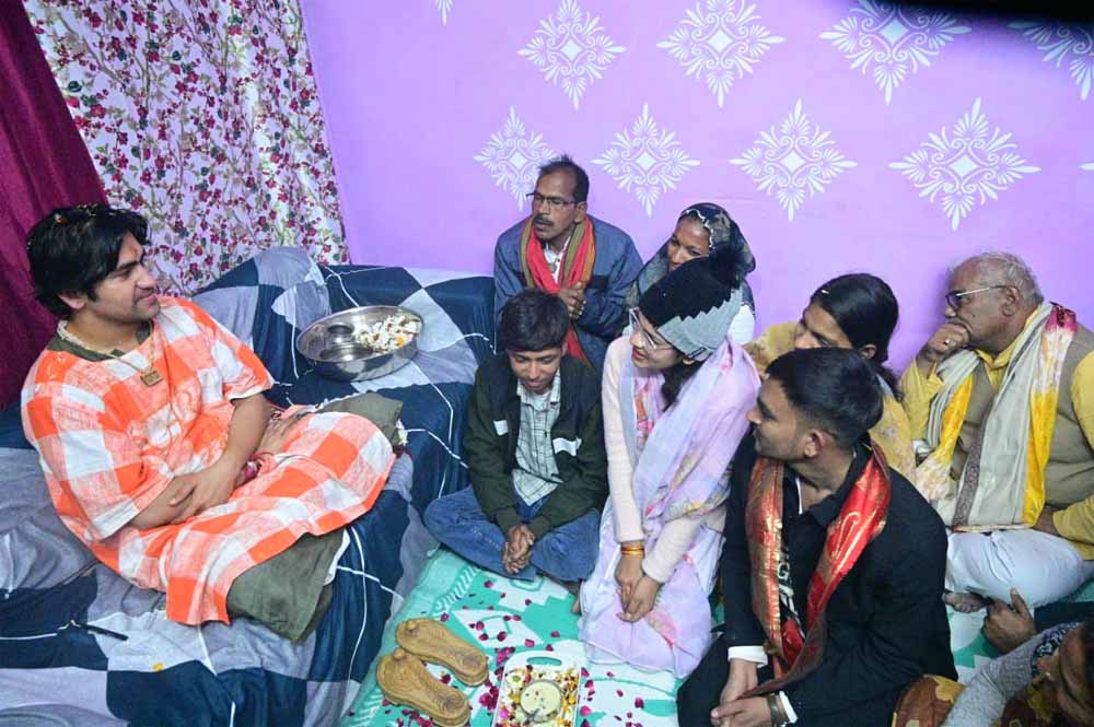 लेकिन बागेश्वर धाम सरकार का आशीर्वाद है कि बेटियों का सपना पूरा हुआ और आज स्वयं आप भगवान के रूप में हमारे घर पधारे हैं! आचार्य धीरेंद्र शास्त्री ने खुशबू के सर पर हाथ फेरते हुए कहा कि आज से हम तुम्हारे भाई हैं! भाई की कमी कभी महसूस मत करना! आचार्य धीरेंद्र शास्त्री ने अपनी बहन के घर लगभग आधा घंटा बैठकर चाय पी और उसके माता-पिता व उपस्थित अन्य परिजनों से हाल-चाल पूछे! और घर से विदा होने से पहले अपनी दोनों बहनों को बागेश्वर धाम आने का निमंत्रण दिया! आचार्य धीरेंद्र शास्त्री ने बच्चियों के पिता लाल चंद्र राठौर को बागेश्वर धाम की तरफ से एक कूपन भी दिया! आचार्य धीरेंद्र शास्त्री के साथ शिक्षा एवं पंचायती राज मंत्री मदन दिलावर भी उपस्थित थे!