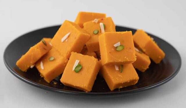 जब बर्फी जम जाए तो इसे अपनी पसंद के आकार में काट लें। बेसन की बर्फी बनकर तैयार है।
