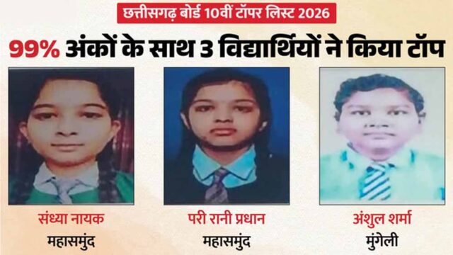 10वीं की परीक्षा में टॉप 3 में महासमुंद जिले की 2 लड़कियों ने 594 नंबर के साथ बाजी मारी है। इनमें एकलव्य इंग्लिश स्कूल अर्जुंदा की संध्या नायक और एकलव्य स्कूल बलोदा की परीरानी प्रधान शामिल हैं। वहीं तीसरे स्थान पर मुंगेली के अंशुल शर्मा रहे। इन तीनों ने ही 99.00% अंक प्राप्त किए हैं। 42 स्टूडेंट्स ने टॉप-10 में जगह बनाई है। बता दें कि बोर्ड परीक्षाएं 20 और 21 फरवरी से शुरू हुई थीं, जो 18 मार्च तक चलीं। पहले बोर्ड ने 15 अप्रैल तक परिणाम जारी करने की योजना बनाई थी, लेकिन 12वीं हिंदी का पेपर लीक होने का मामला सामने आने के बाद 10 अप्रैल को दोबारा परीक्षा आयोजित करनी पड़ी थी, जिसके कारण रिजल्ट में देरी हुई।
